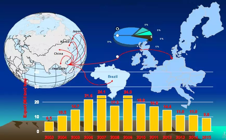 越南出口的煤炭从2007年的2480万吨减少到2012年的1400万吨。优质煤出口欧盟、日本、韩国、台湾、印度……;中质粉煤主要出口中国等国家。