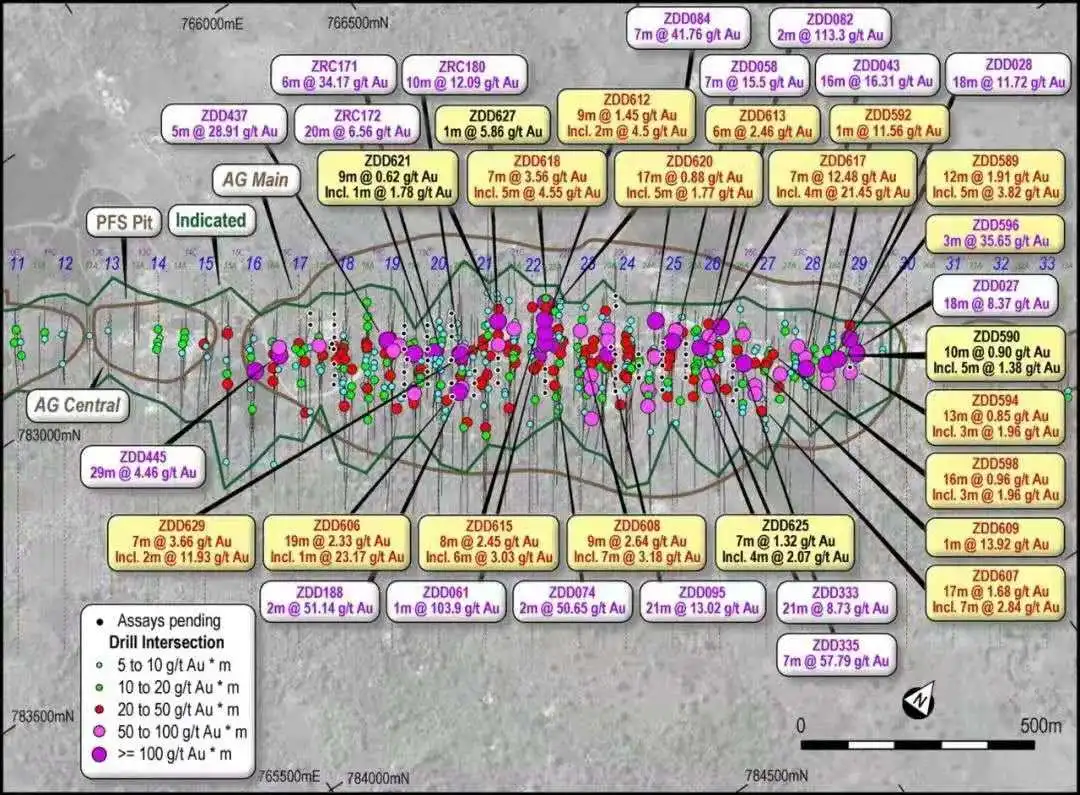 铁拓在其335万盎司黄金资源量的阿布贾金矿项目AG矿体核心区的加密钻探再次钻获多个高品位金矿段,包括: