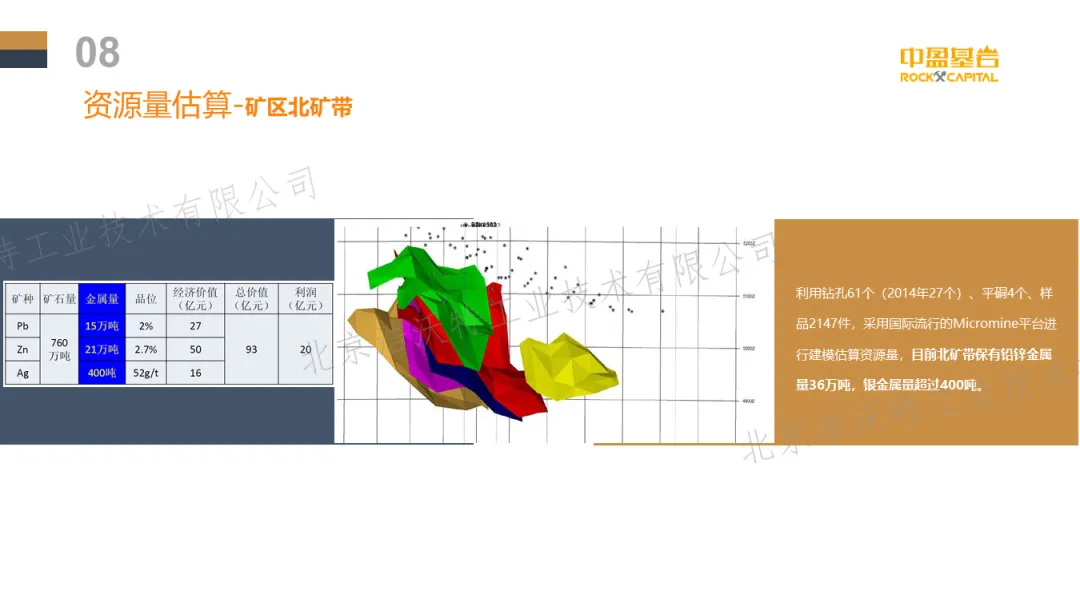 根据矿体空间分布特征及矿石类型,共圈出6条主要矿体。北矿带保有铅锌金属量36万吨,银金属量超过400吨 。(现有勘探基础)