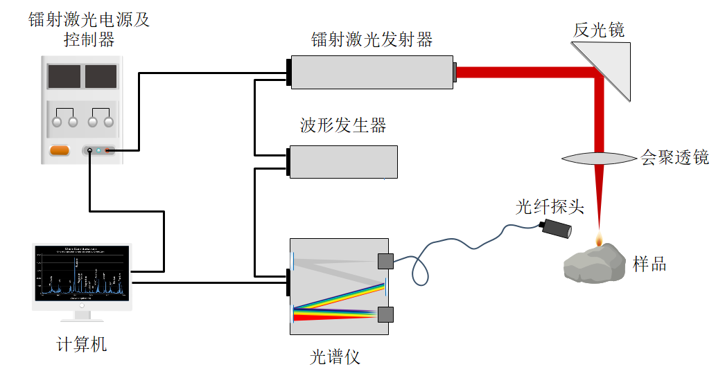 激光经透镜聚焦在样品表面,当激光脉冲的能量大于样品的击穿门槛能量时,便会在样品表面局部产生等离子体,这一过程即为激光诱导等离子体。等离子体向外界环境膨胀过程中逐渐冷却,并发射表征样品组分信息的光谱。利用光电探测器和光谱仪对等离子体发射的光谱进行采集,通过解析等离子体光谱,并结合定量分析模型,即可得到分析样品组分的类别和含量信息。