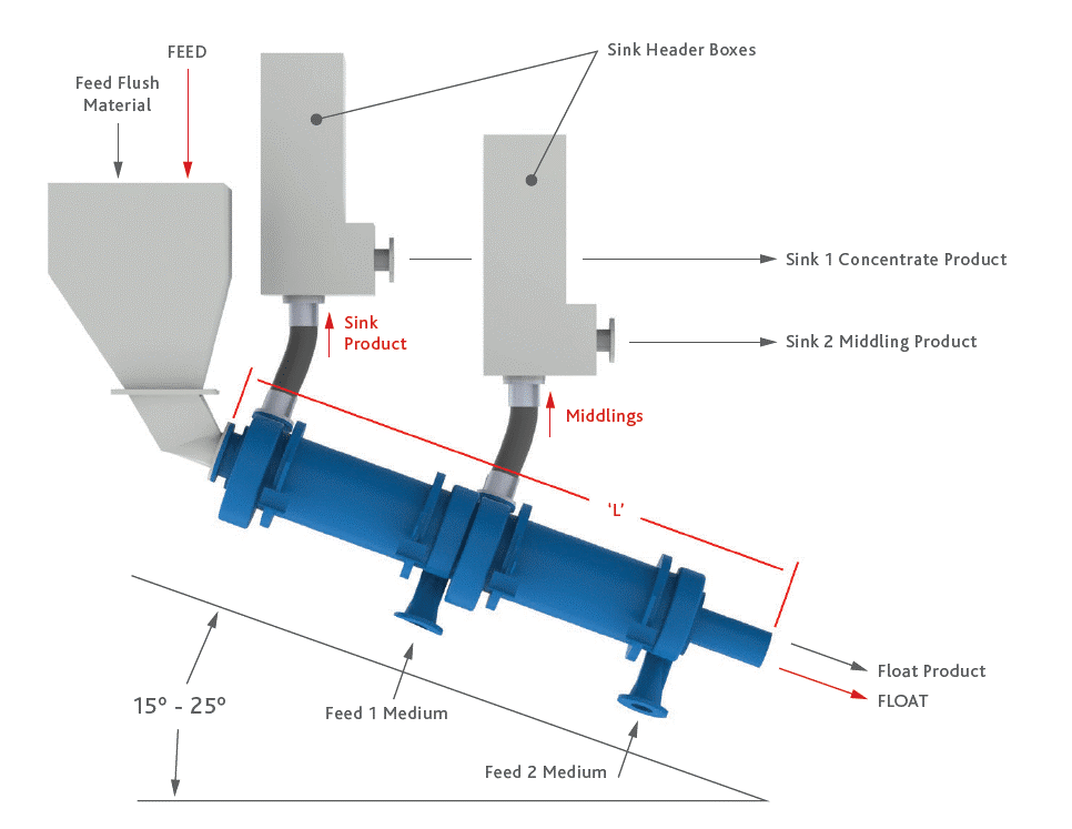 重介质分选器基于颗粒的密度单独分选它们。重介质分选器可以设计成将颗粒分为两个产品(精矿和尾矿)或三个产品(精矿、中间产物、尾矿)。