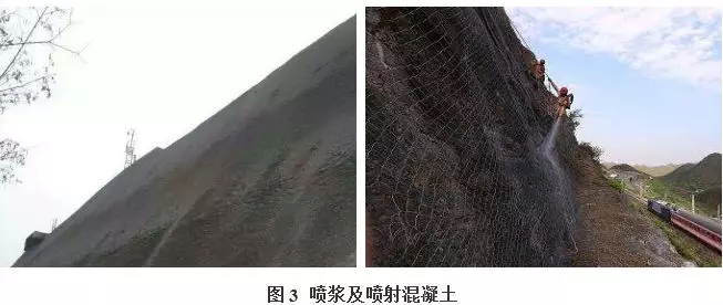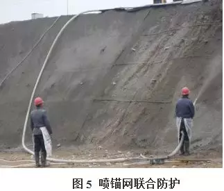 当坡面岩体已严重风化或岩体受切割破碎严重,喷浆或喷射混凝土防护强度不足时,为加强防护效果,应采用喷锚网联合防护。喷射混凝土与钢筋网封闭坡面,锚杆既可加固坡面一定深度内岩体,也可承受少量松散体产生的侧压力。