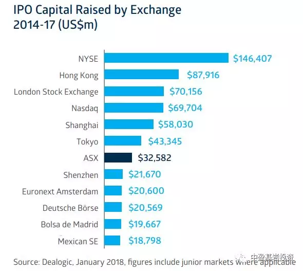 从融资规模看,能够查到最近的公开数据显示,澳大利亚ASX证券市场排在全球第七位(中国深交所排在第八位),如下图,货币单位:百万美元。