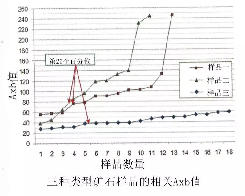 落锤试验参数Axb用于矿石在半自磨中和自磨机的磨矿计算。图2是三种不同矿石落锤试验的Axb值的分布,三种矿石分别采样自浅层和深层的矽卡岩矿化的矿体。